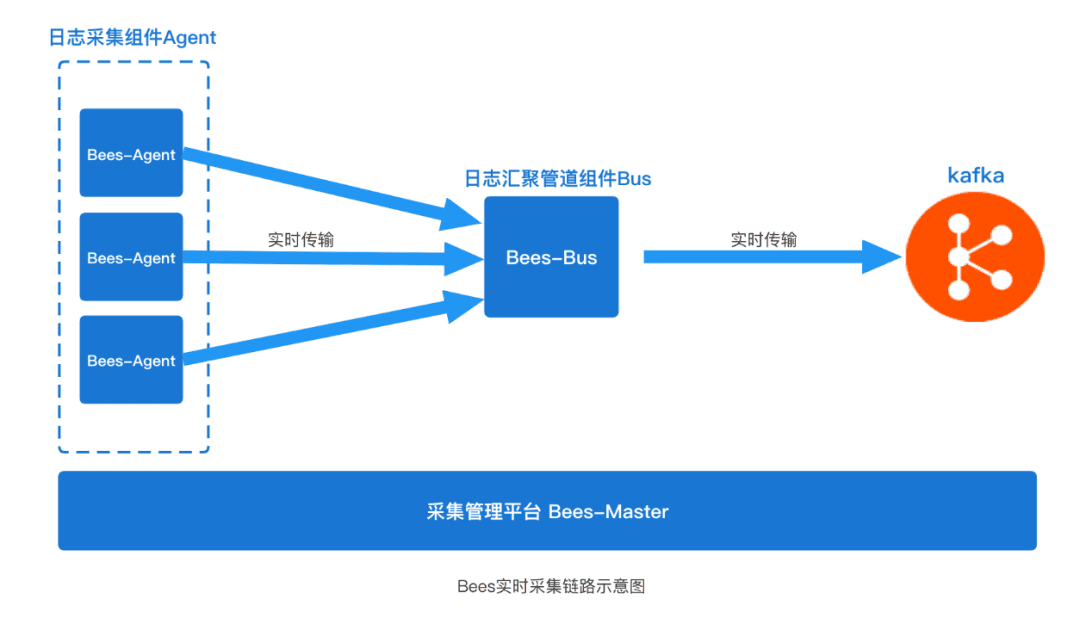 最简单的模型是,Agent通过Kafka Client把数据直接发送到Kafka分布式消息中间件,这也是一种简洁可行的方案。实际上在Bees的采集链路架构中,在Agent与Kafka的数据链路中我们增加了一个"组件bees-bus“(如下图所示)。