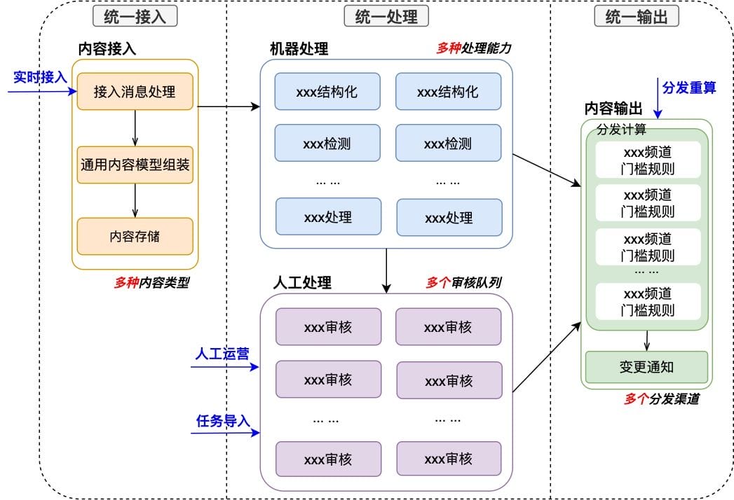 - 统一接入 :统一内容数据模型,对接不同的内容生产方,将异构的内容转化为内容平台通用的数据模型。