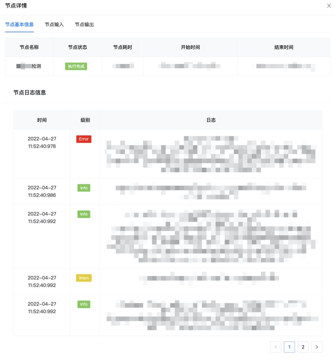 【节点详情查询功能】 :支持展示任意已执行节点的详情,包括节点输入、输出,以及节点执行过程中的关键业务日志。