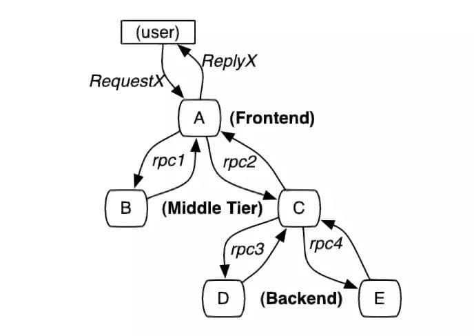 市面上的同类型框架几乎都是以Google Dapper论文为基础进行实现,整体大同小异,都是通过一个分布式全局唯一的id(即traceId),将分布在各个服务节点上的同一次请求串联起来,还原调用关系、追踪系统问题、分析调用数据、统计系统指标。分布式会话跟踪,是一种会话级别 的追踪能力,如下图2所示,单个分布式请求被还原成一条调用链路,从客户端发起请求抵达系统的边界开始,记录请求流经的每一个服务,直到向客户端返回响应为止。
