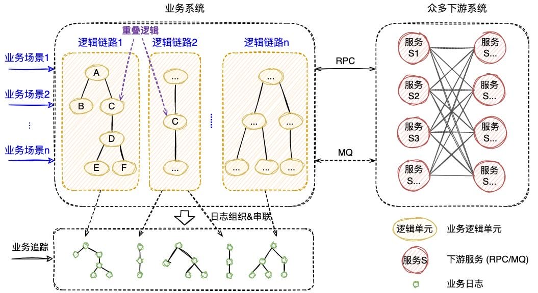 - 日志筛选困难 :不同业务场景、业务逻辑之间存在重叠,重叠逻辑打印的业务日志可能相互干扰,难以从中筛选出正确的关联日志。