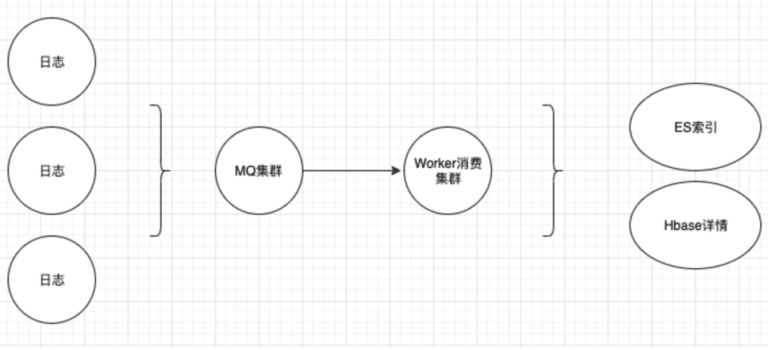 以一个常见的日志传输及存储方案来举例,如下图,暂存就是采用客户端写本地文件存日志,传输即是采用MQ,消费入库常见的如ES。下图方案,为了减少部分存储成本,将日志详情存储于压缩更好的Hbase,仅将查询时需要的一些索引字段放在了ES。