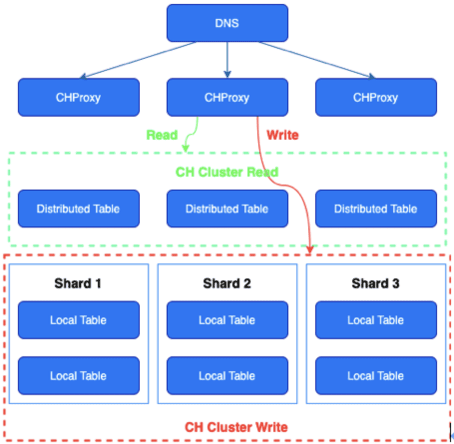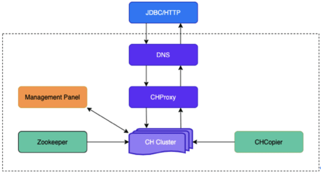 EasyOLAP部署CH集群是三层结构:域名 + CHProxy + CH节点,域名转发请求到CHProxy,再由CHProxy根据集群节点状态来转发。CHProxy的引入是为了让Query均匀分布在每个节点上,,并对CHProxy做了一定的改进,自动感知集群节点的状态变化。