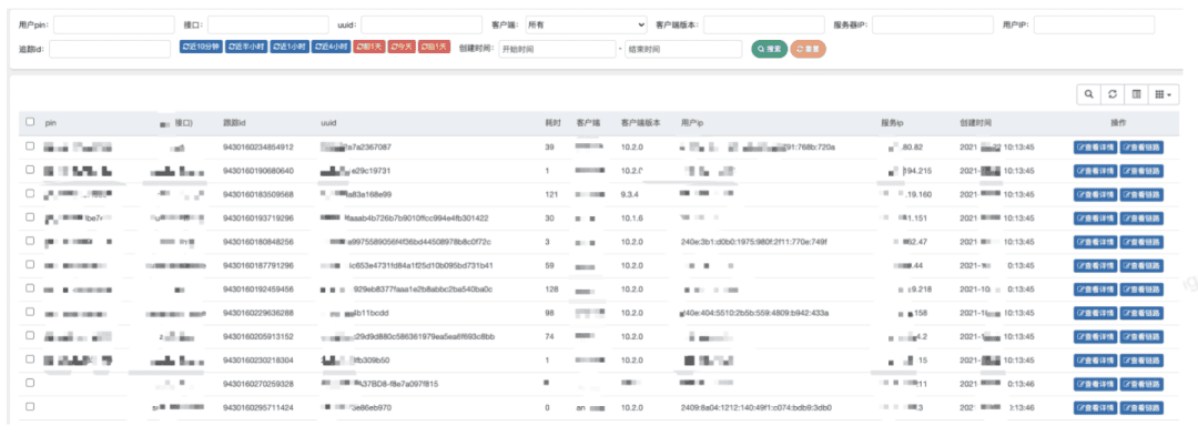 下图界面展示的即为一些索引项,点击查看详情,则从数据库捞出压缩过的数据,此时才解压并展示给前端。查看链路,则是该次请求中,整个链路用户打印的log(包括线程池内的)。