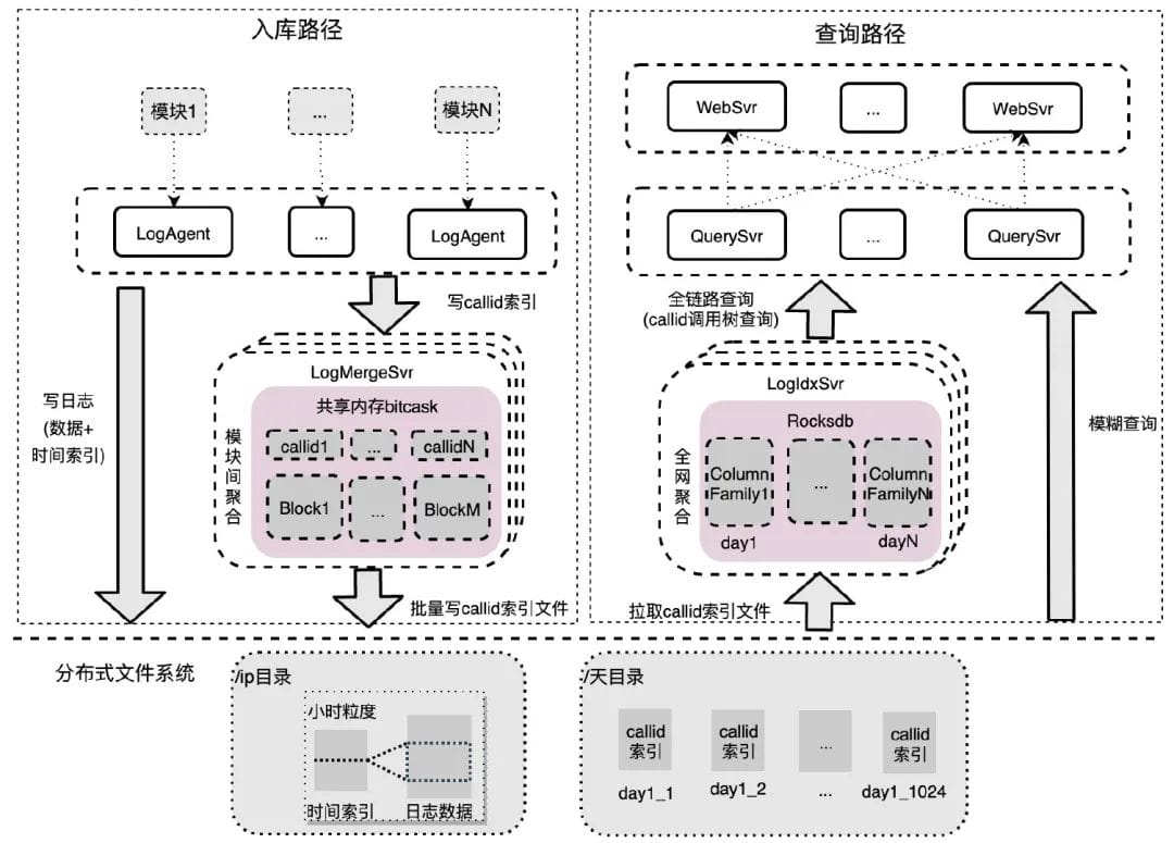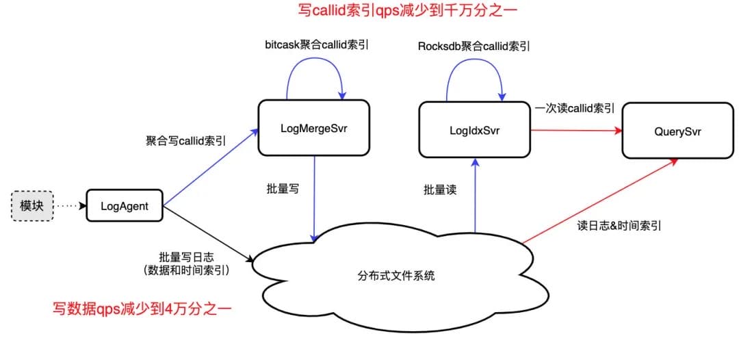 - 模块间聚合 :LogMergeSvr 聚合模块间一段时间内的 callid 索引,批量写分布式文件系统,qps 约减少到千分之一;