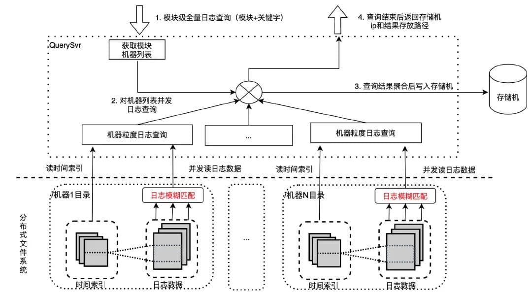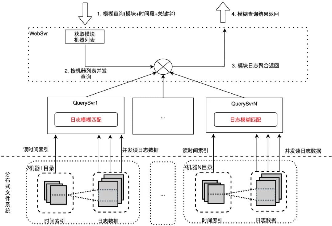 - 原始版本 :并发检索 WebSvr 接收用户模糊查询请求(模块+时间段+关键字),依据模块获取机器列表后,按机器列表并发请求到多台 QuerySvr 执行机器粒度日志查询:通过机器 IP 找到机器日志目录,根据时间段拉取时间索引文件,确定日志数据范围,并发拉取日志到本机用关键字做模糊匹配。最终将匹配后的日志返回给 WebSvr 聚合展示给用户。