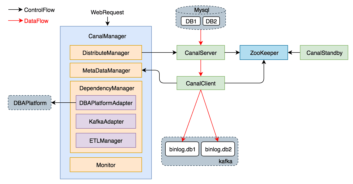 - 高可用:CanalManager对Instance进行分发时,会选择两台CanalServer,一台是Running节点,另一台作为Standby节点。Standby节点会对该Instance进行监听,当Running节点出现故障后,临时节点消失,然后Standby节点进行抢占。这样就达到了容灾的目的。