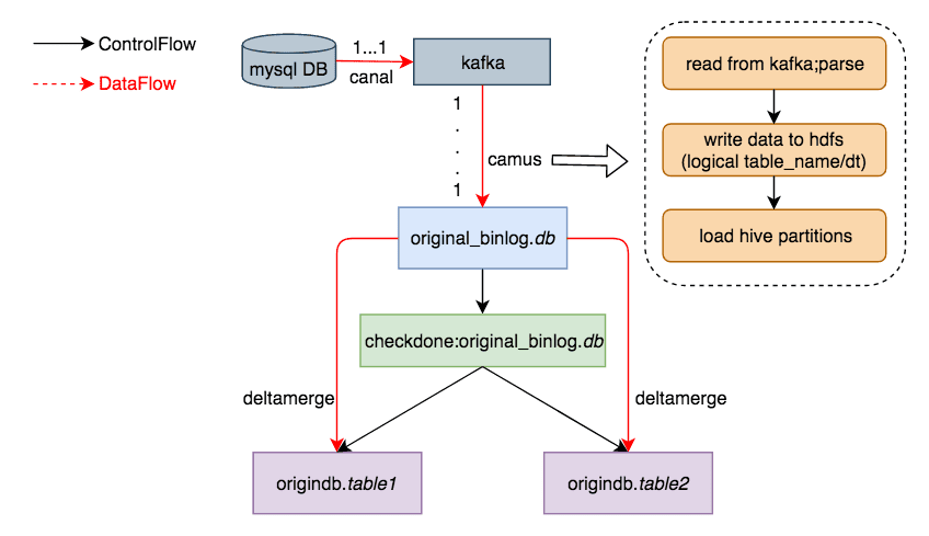 - 采用Linkedin的开源项目Camus,负责每小时把Kafka上的Binlog数据拉取到Hive上。
