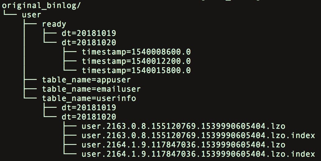 上图说明了一个Kafka2Hive完成后,文件在HDFS上的目录结构。假如一个MySQL DB叫做user,对应的Binlog存储在original_binlog.user表中。ready目录中,按天存储了当天所有成功执行的Kafka2Hive任务的启动时间,供Checkdone使用。每张表的Binlog,被组织到一个分区中,例如userinfo表的Binlog,存储在table_name=userinfo这一分区中。每个table_name一级分区下,按dt组织二级分区。图中的xxx.lzo和xxx.lzo.index文件,存储的是经过lzo压缩的Binlog数据。