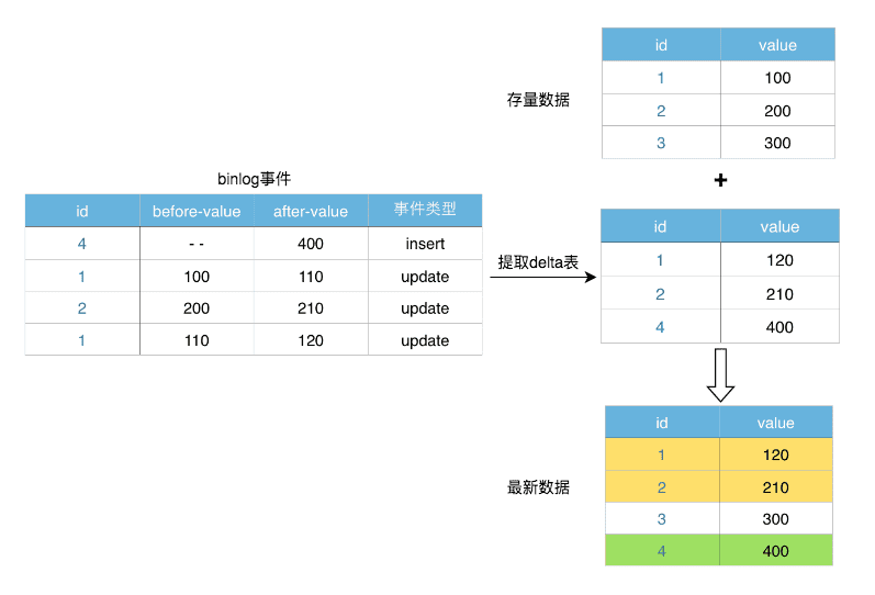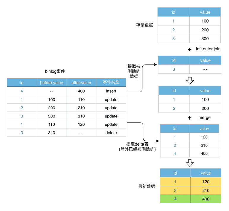 数据表共id、value两列,其中id是主键。在提取Delta数据时,对同一条数据的多次更新,只选择最后更新的一条。所以对id=1的数据,Delta表中记录最后一条更新后的值value=120。Delta数据和存量数据做Merge后,最终结果中,新插入一条数据(id=4),两条数据发生了更新(id=1和id=2),一条数据未变(id=3)。