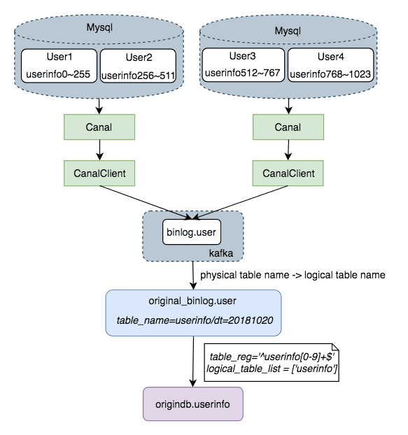 这里面有一个技术上的优化,在进行Kafka2Hive时,我们按业务分表规则对表名进行了处理,把物理表名转换成了逻辑表名。例如userinfo123这张表名会被转换为userinfo,其Binlog数据存储在original_binlog.user表的table_name=userinfo分区中。这样做的目的是防止过多的HDFS小文件和Hive分区造成的底层压力。