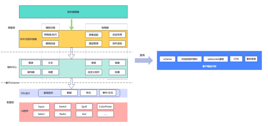 };- ② schema 组件配置协议层 + 组件定义层 (类型、从属关系、初始化宽高等)