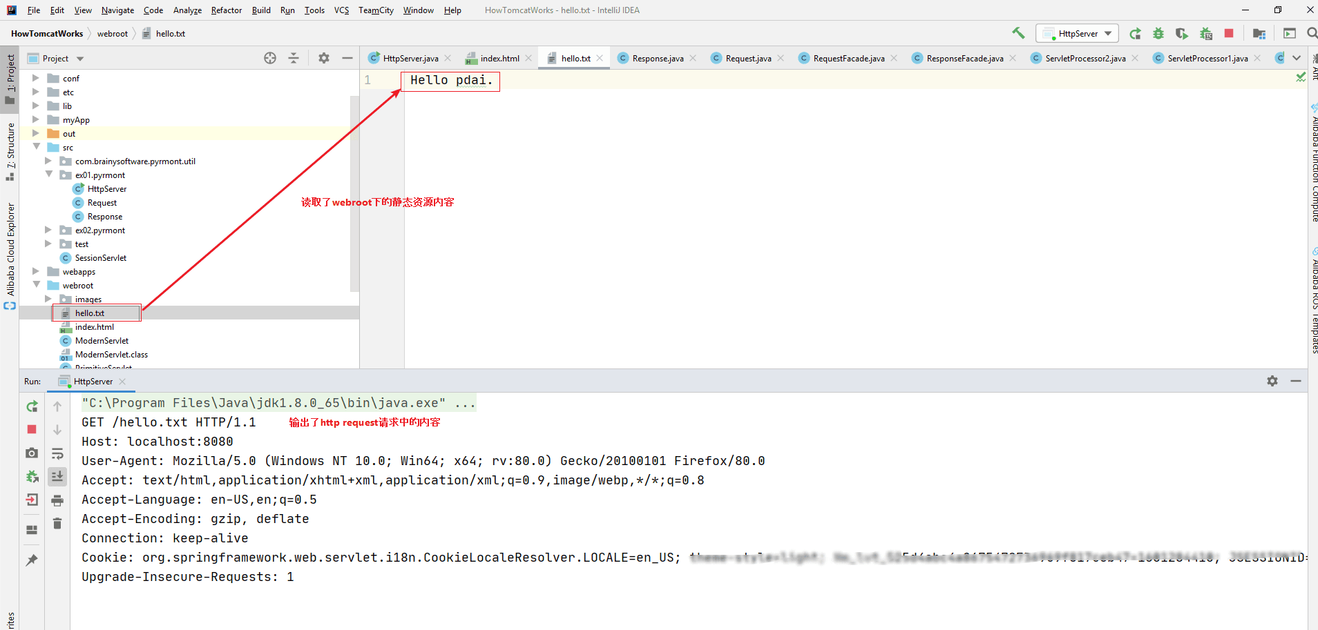 当我们run上面HttpServer中的main方法之后,我们就可以打开浏览器http://localhost:8080, 后面添加参数看返回webroot目录中静态文件的内容了(比如这里我加了hello.txt文件到webroot下,并访问http://localhost:8080/hello.txt)。