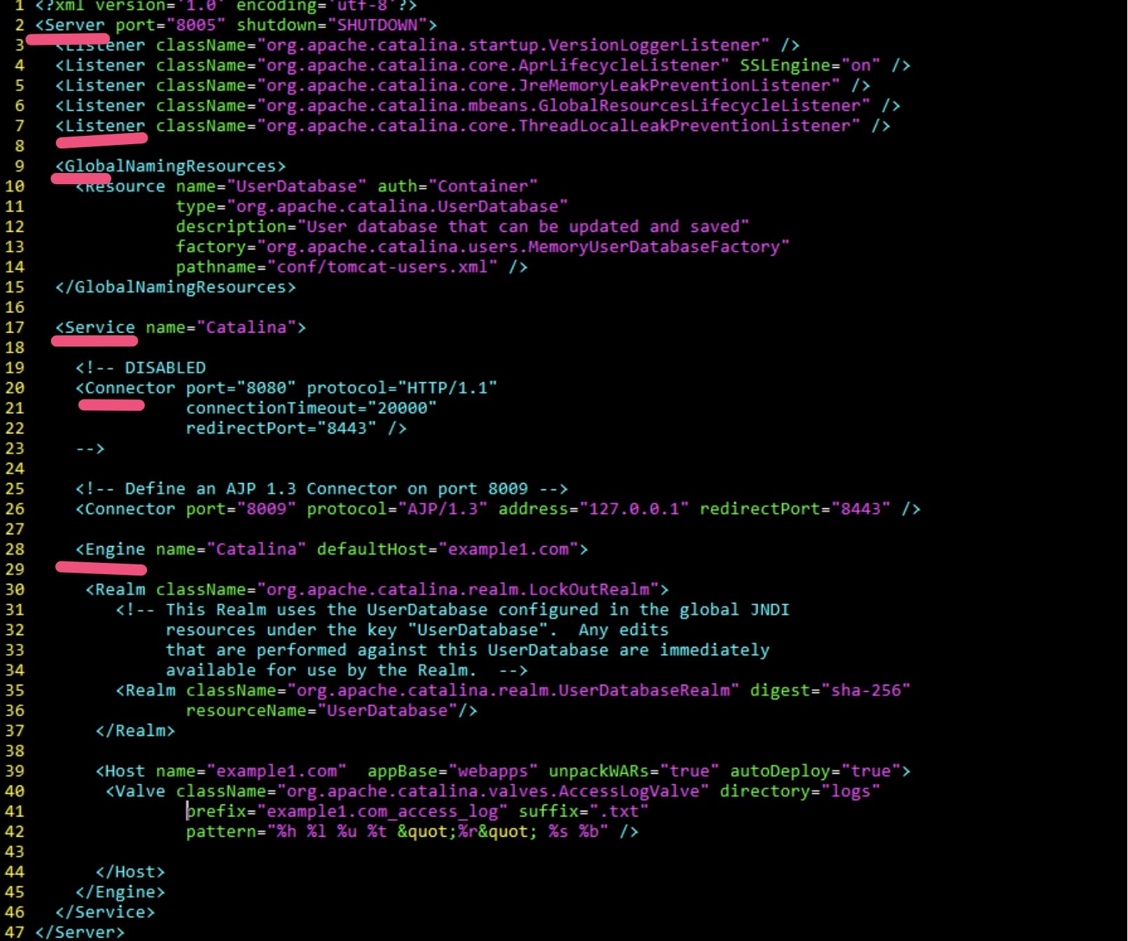 Server : 表示服务器,它提供了一种优雅的方式来启动和停止整个系统,不必单独启停连接器和容器;它是Tomcat构成的顶级构成元素,所有一切均包含在Server中;