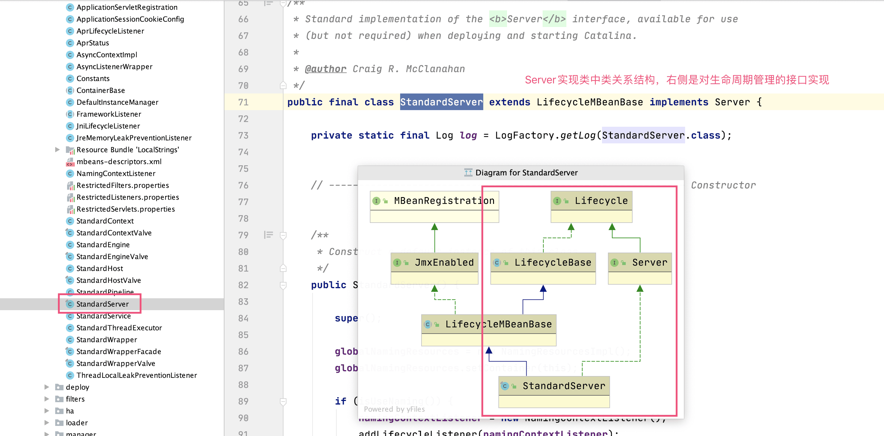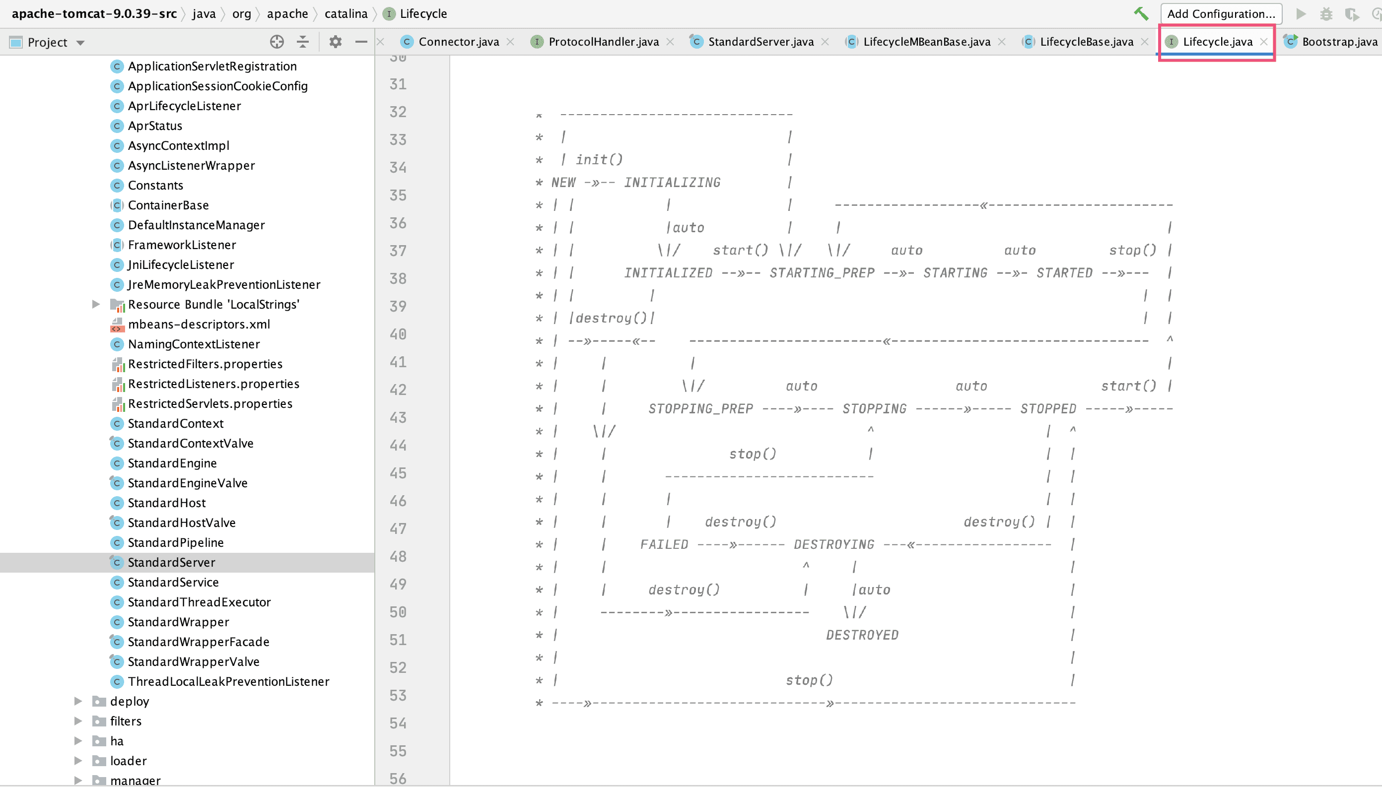 上文中,我们已经知道Catalina初始化了Server(它调用了 Server 类的 init 和 start 方法来启动 Tomcat);你会发现Server是Tomcat的配置文件server.xml的顶层元素,那这个阶段其实我们已经进入到Tomcat内部组件的详解;这时候有一个问题,这么多组件是如何管理它的生命周期的呢?@anarkh