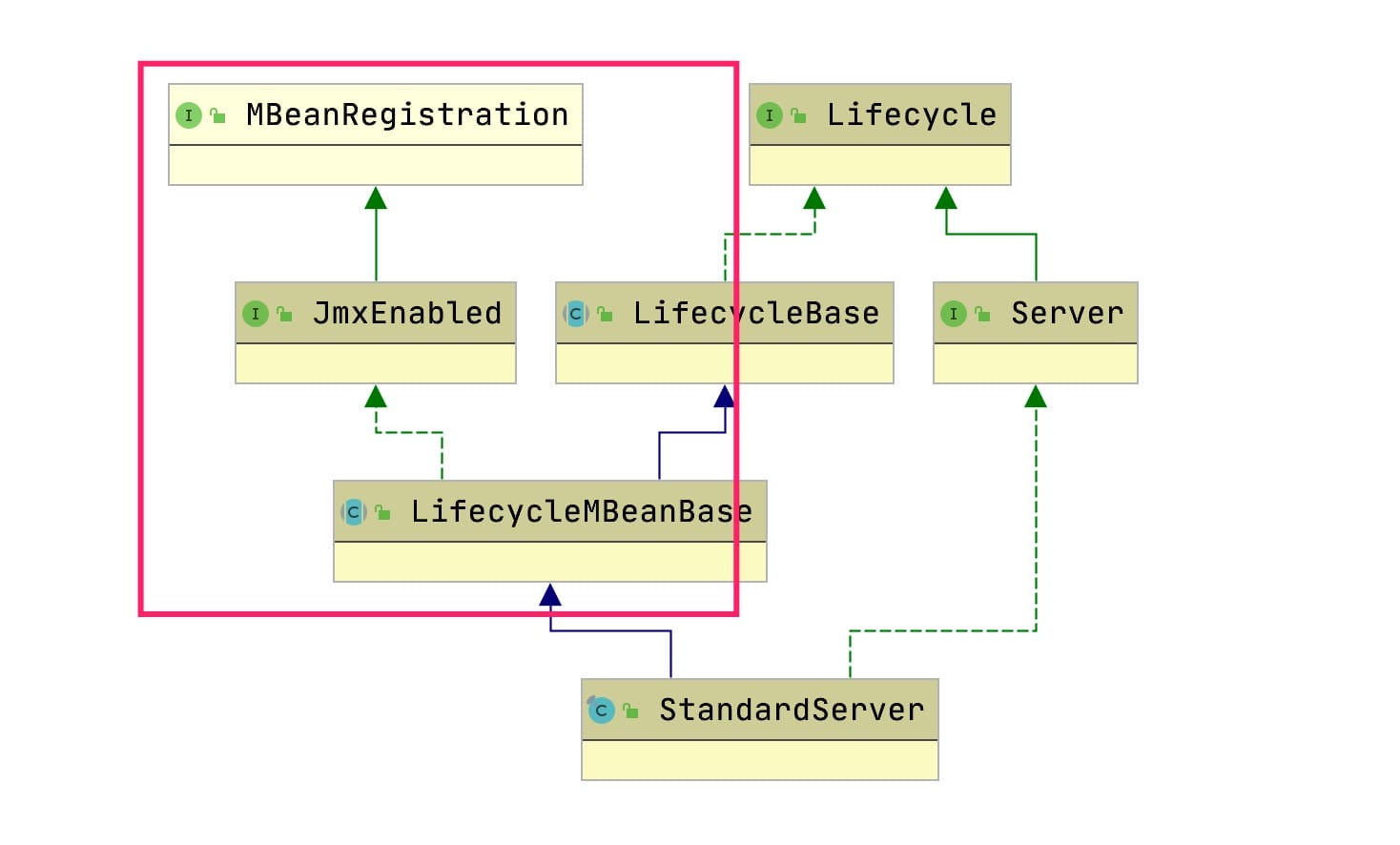 这样理解LifecycleMBeanBase时,你便知道它包含两块,一个是Lifecycle的接口实现,一个是Jmx接口封装实现。