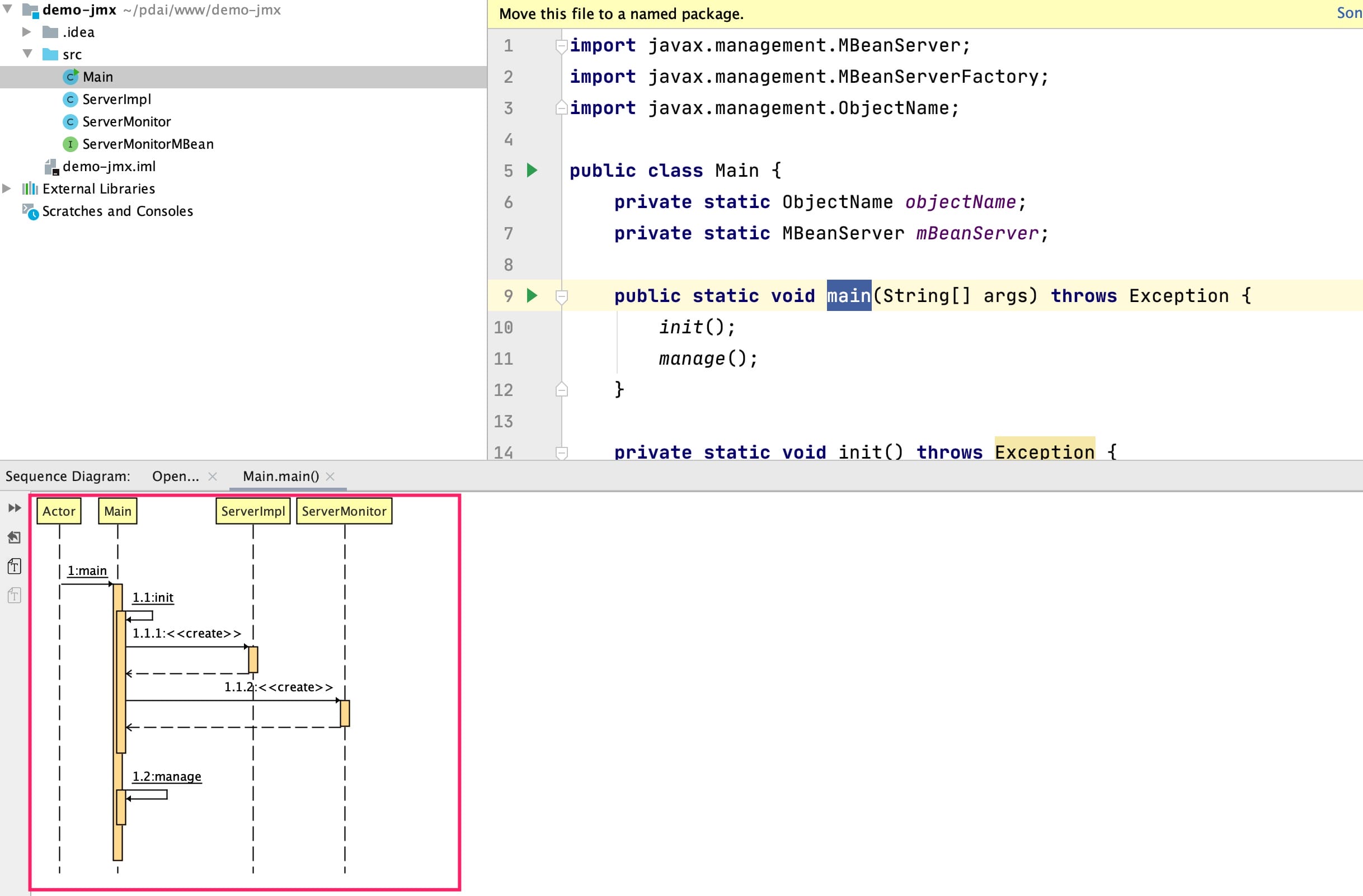 }- 对于管理系统来讲,这些MBean中公开的方法,最终会被JMX转换为属性(Attribute)、监听(Listener)和调用(Invoke)的概念。下面代码中Main类的manage方法就模拟了管理程序是如何获取监测到的属性,并表现监测结果。