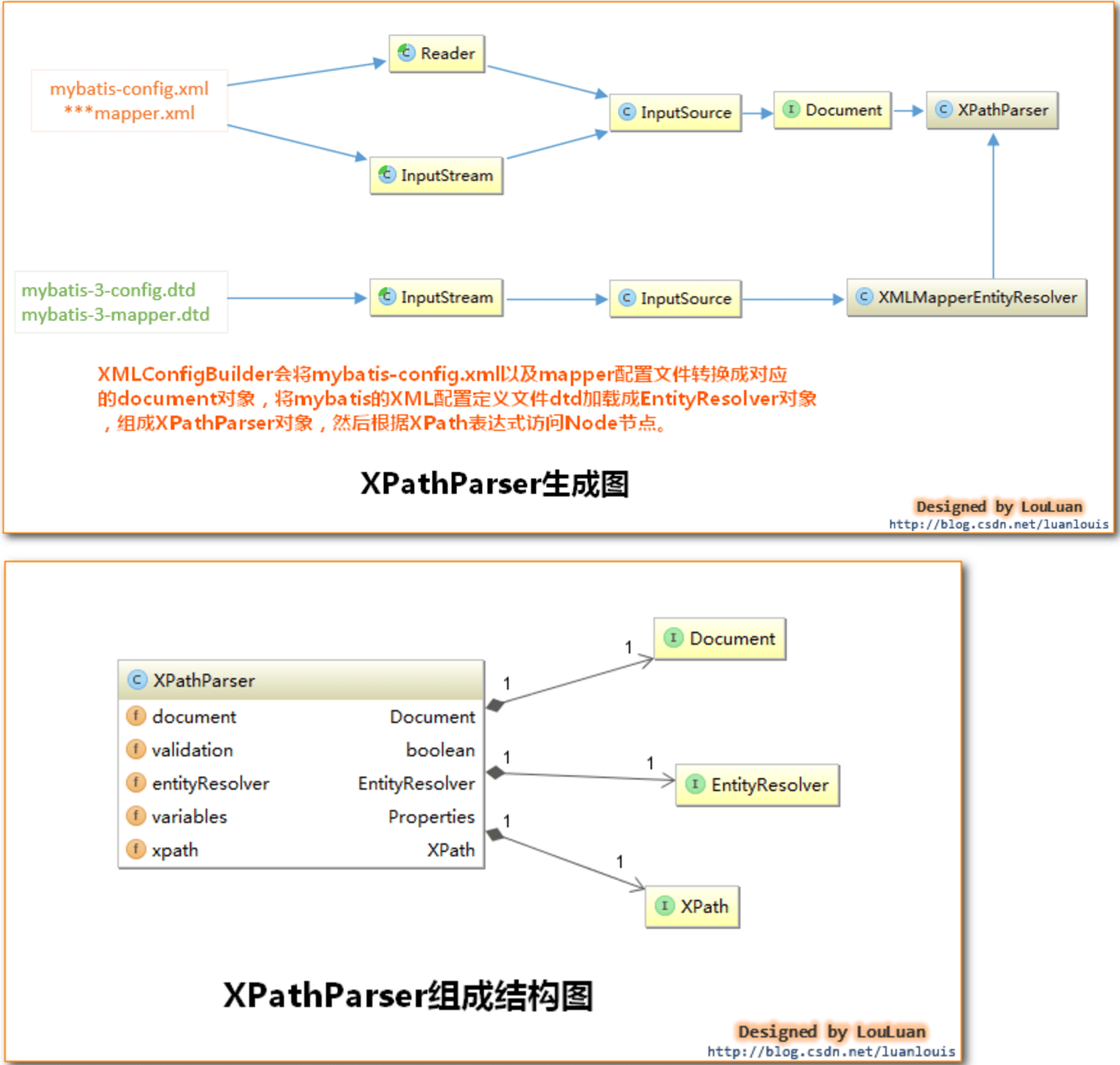 而XML配置定义文件DTD转换成XMLMapperEntityResolver对象,然后将二者封装到XpathParser对象中,XpathParser的作用是提供根据Xpath表达式获取基本的DOM节点Node信息的操作。如下图所示: