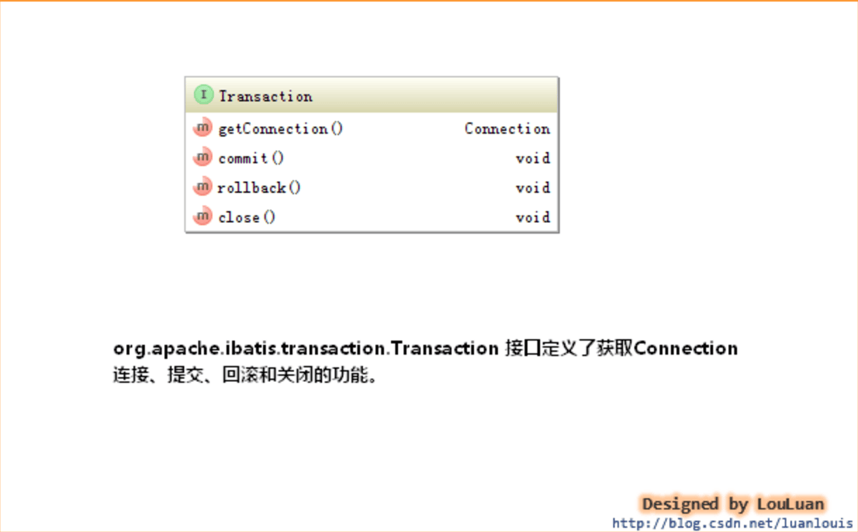 对数据库的事务而言,应该具有以下几点:创建(create)、提交(commit)、回滚(rollback)、关闭(close)。对应地,MyBatis将事务抽象成了Transaction接口: