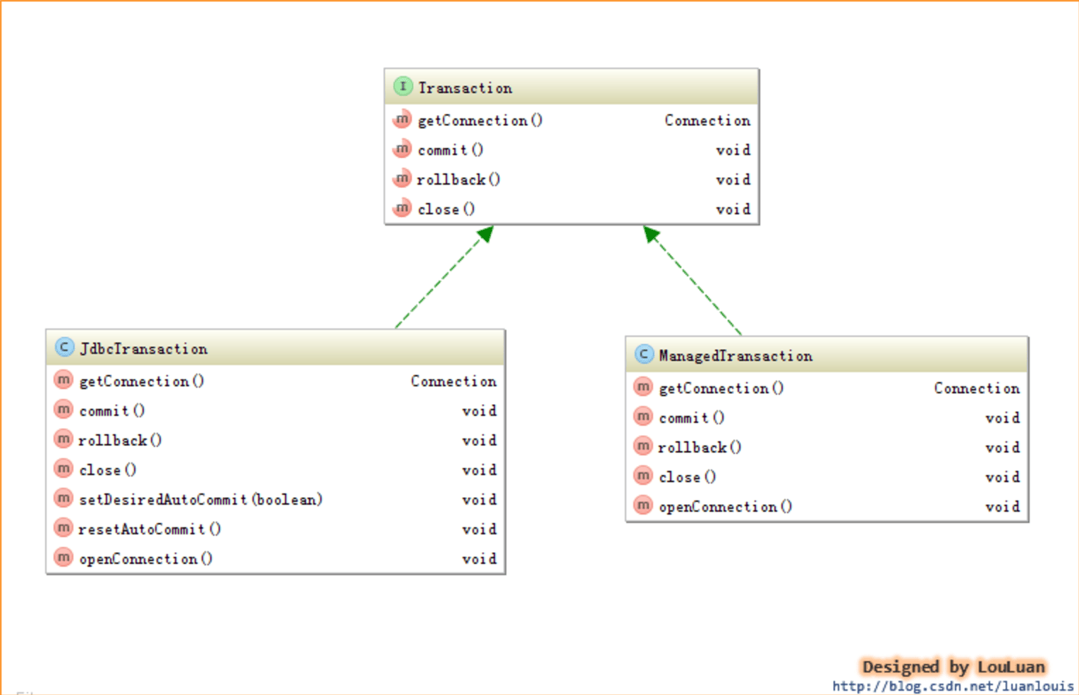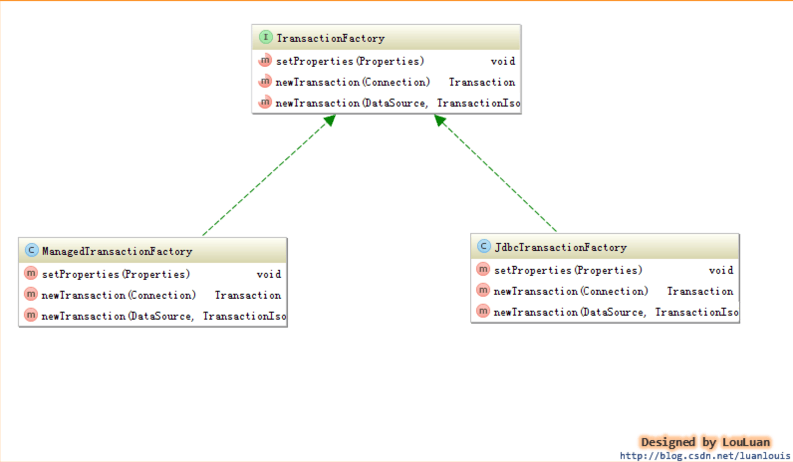 }如上说是,JdbcTransactionFactory会创建JDBC类型的Transaction,即JdbcTransaction。类似地,ManagedTransactionFactory也会创建ManagedTransaction。下面我们会分别深入JdbcTranaction 和ManagedTransaction,看它们到底是怎样实现事务管理的。