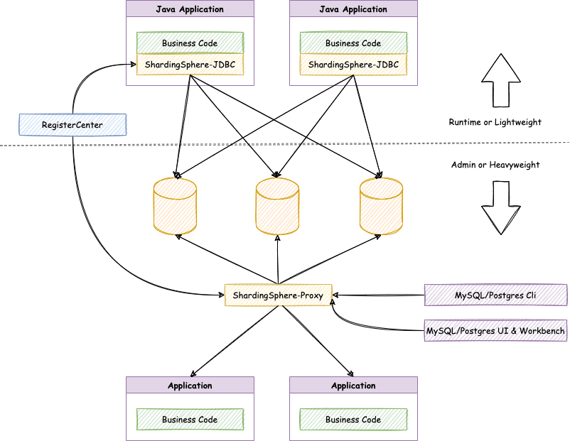 Apache ShardingSphere 由 JDBC、Proxy 和 Sidecar(规划中)这 3 款既能够独立部署,又支持混合部署配合使用的产品组成。 它们均提供标准化的基于数据库作为存储节点的增量功能,可适用于如 Java 同构、异构语言、云原生等各种多样化的应用场景。