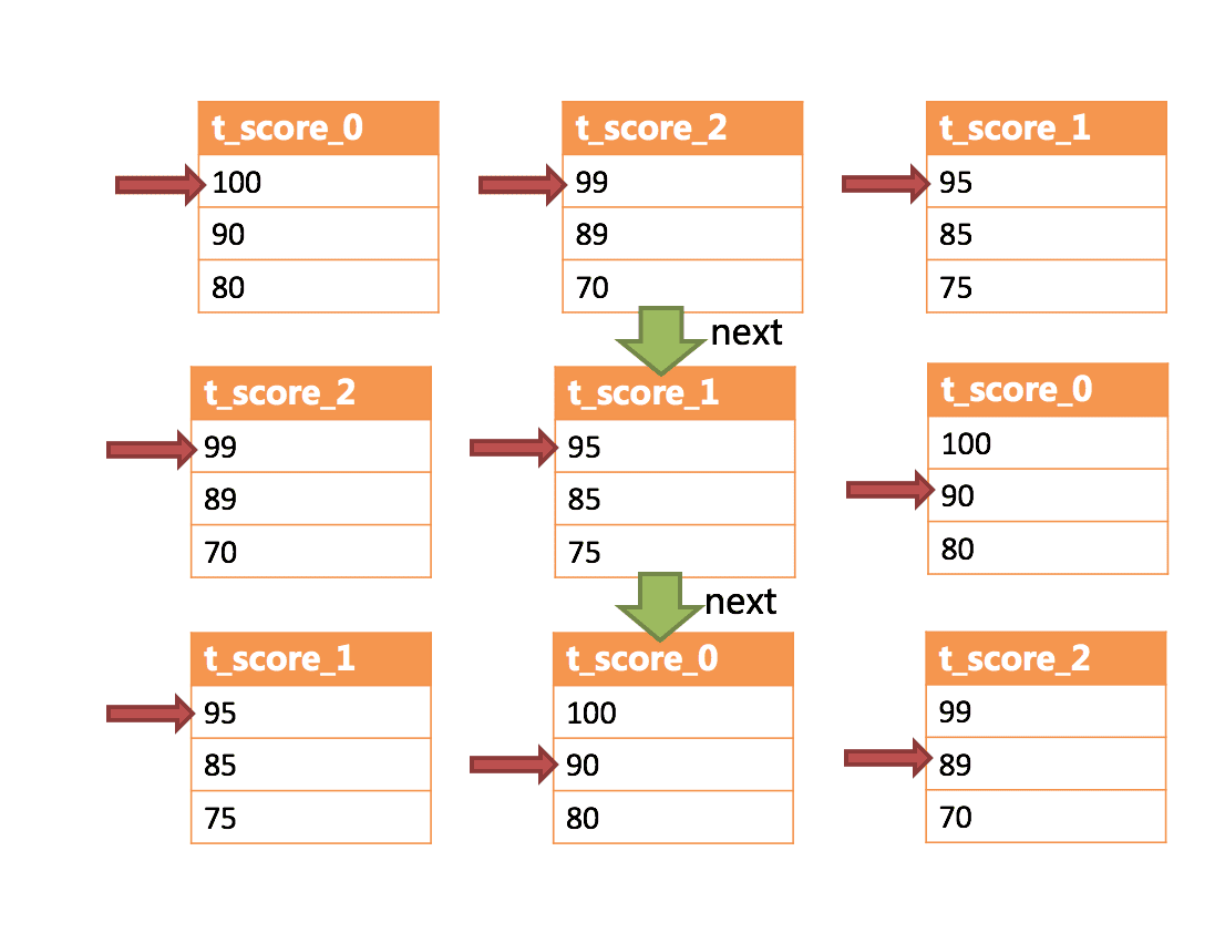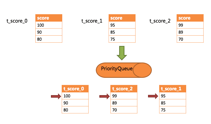 下图则展现了进行next调用的时候,排序归并是如何进行的。 通过图中我们可以看到,当进行第一次next调用时,排在队列首位的t_score_0将会被弹出队列,并且将当前游标指向的数据值(也就是100)返回至查询客户端,并且将游标下移一位之后,重新放入优先级队列。 而优先级队列也会根据t_score_0的当前数据结果集指向游标的数据值(这里是90)进行排序,根据当前数值,t_score_0排列在队列的最后一位。 之前队列中排名第二的t_score_2的数据结果集则自动排在了队列首位。