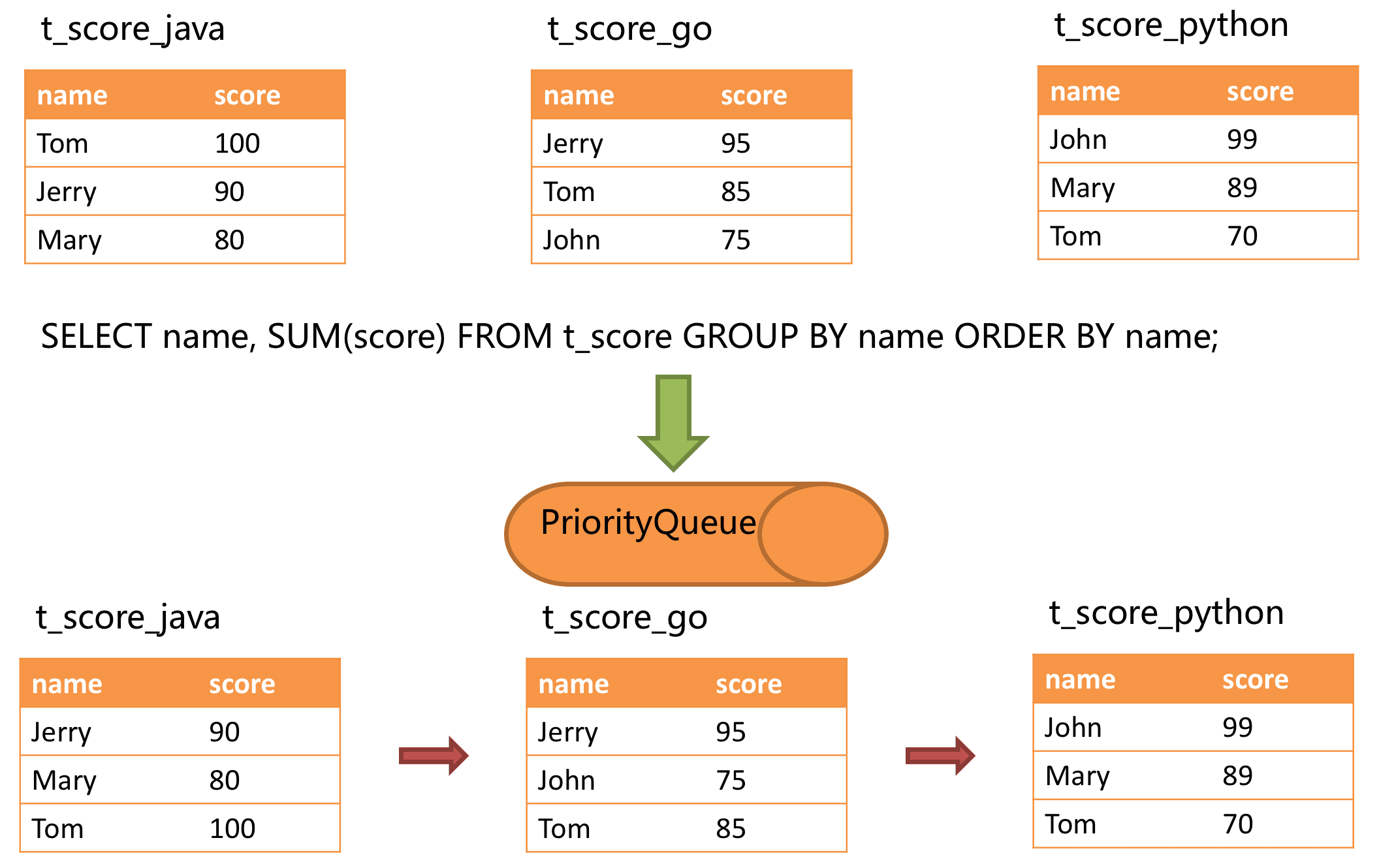 SELECT name, SUM(score) FROM t_score GROUP BY name ORDER BY score DESC;那么各个数据结果集中取出的数据与排序归并那张图的上半部分的表结构的原始数据一致,是无法进行流式归并的。