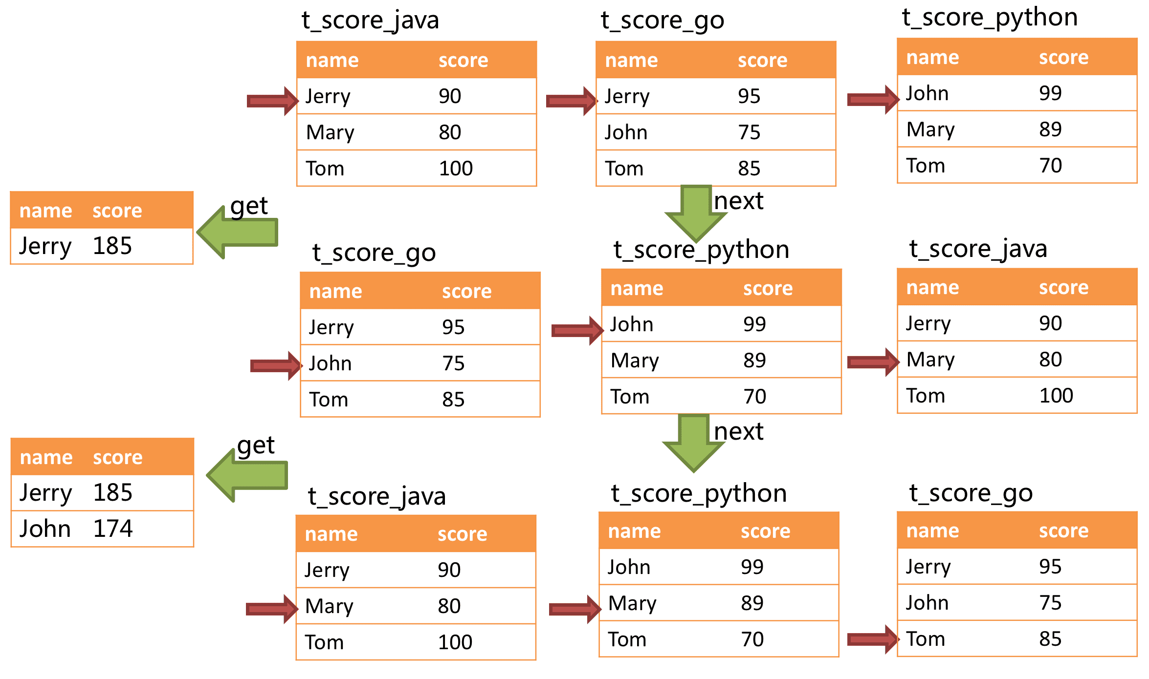 在进行第二次next时,只需要将目前排列在队列首位的t_score_2弹出队列,并且将其数据结果集游标指向的值返回至客户端,并下移游标,继续加入队列排队,以此类推。 当一个结果集中已经没有数据了,则无需再次加入队列。