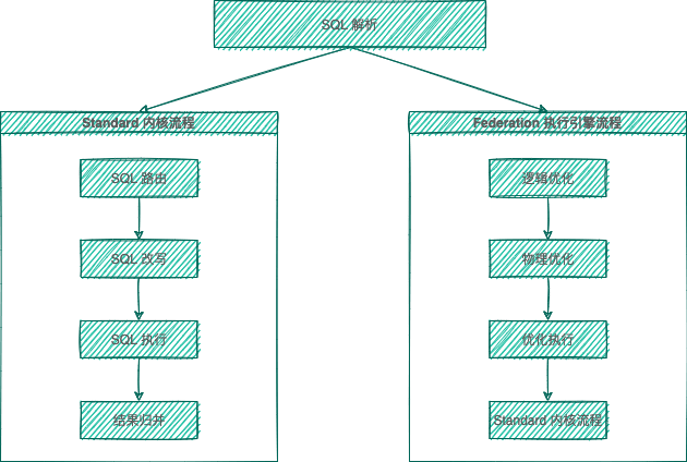 ShardingSphere 的 3 个产品的数据分片主要流程是完全一致的,按照是否进行查询优化,可以分为 Standard 内核流程和 Federation 执行引擎流程。 Standard 内核流程由 SQL 解析 => SQL 路由 => SQL 改写 => SQL 执行 => 结果归并 组成,主要用于处理标准分片场景下的 SQL 执行。 Federation 执行引擎流程由 SQL 解析 => 逻辑优化 => 物理优化 => 优化执行 => Standard 内核流程 组成,Federation 执行引擎内部进行逻辑优化和物理优化,在优化执行阶段依赖 Standard 内核流程,对优化后的逻辑 SQL 进行路由、改写、执行和归并。