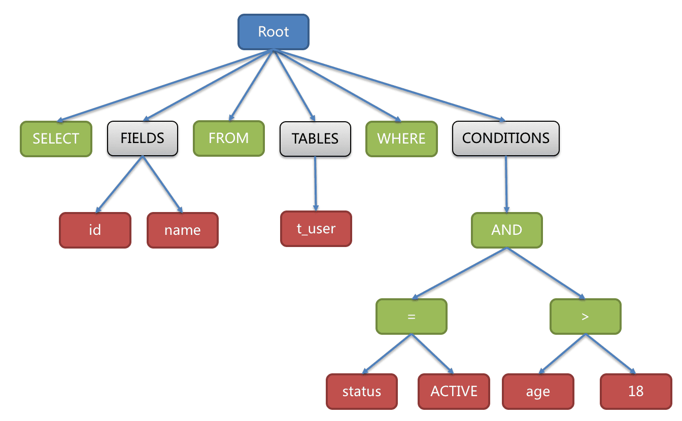SELECT id, name FROM t_user WHERE status = 'ACTIVE' AND age > 18解析之后的为抽象语法树见下图。