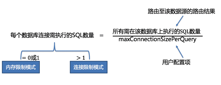 通过下图的公式,可以获得每个数据库实例在maxConnectionSizePerQuery的允许范围内,每个连接需要执行的SQL路由结果组,并计算出本次请求的最优连接模式。