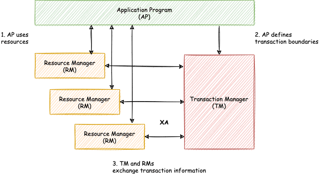 两阶段事务提交采用的是 X/OPEN 组织所定义的 DTP 模型所抽象的 AP(应用程序), TM(事务管理器)和 RM(资源管理器) 概念来保证分布式事务的强一致性。 其中 TM 与 RM 间采用 XA 的协议进行双向通信。 与传统的本地事务相比,XA 事务增加了准备阶段,数据库除了被动接受提交指令外,还可以反向通知调用方事务是否可以被提交。 TM 可以收集所有分支事务的准备结果,并于最后进行原子提交,以保证事务的强一致性。
