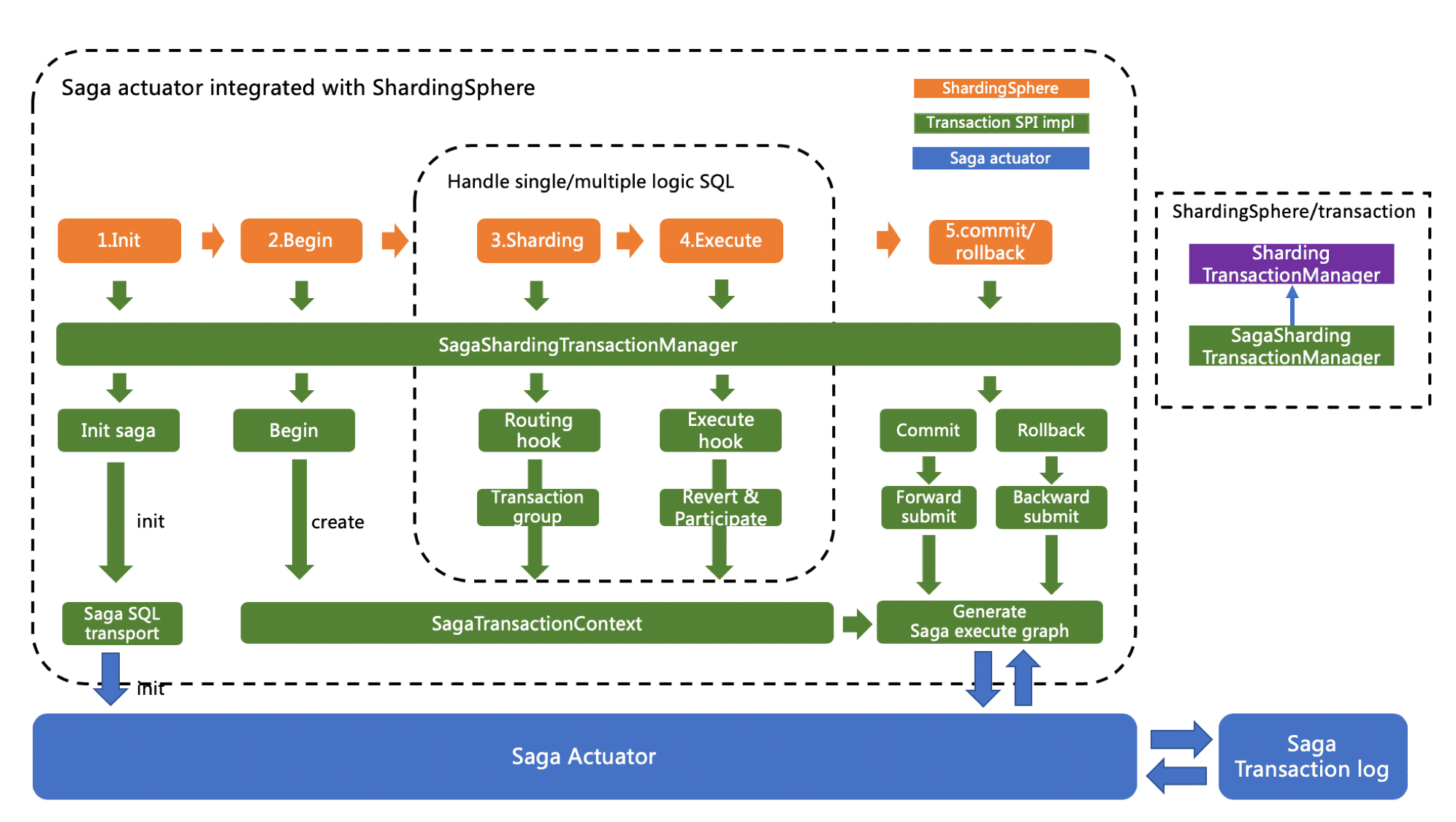 Saga柔性事务的实现类为SagaShardingTransactionMananger, ShardingSphere通过Hook的方式拦截逻辑SQL的解析和路由结果,这样,在分片物理SQL执行前,可以生成逆向SQL,在事务提交阶段再把SQL调用链交给Saga引擎处理。