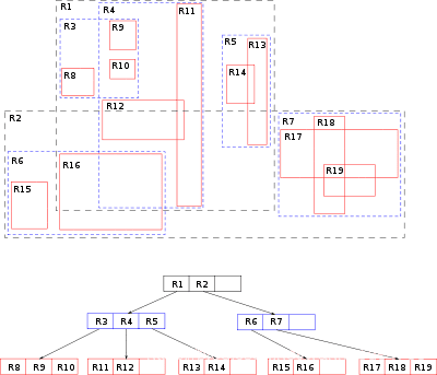 R树的核心思想是聚合距离相近的节点并在树结构的上一层将其表示为这些节点的最小外接矩形(MBR),这个最小外接矩形就成为上一层的一个节点。因为所有节点都在它们的最小外接矩形中,所以跟某个矩形不相交的查询就一定跟这个矩形中的所有节点都不相交。叶子节点上的每个矩形都代表一个对象,节点都是对象的聚合,并且越往上层聚合的对象就越多。也可以把每一层看做是对数据集的近似,叶子节点层是最细粒度的近似,与数据集相似度100%,越往上层越粗糙。