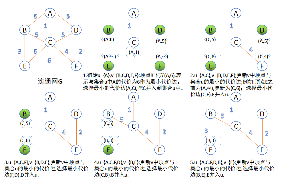 - 在两个集合u,vu,v能够组成的边中,选择一条代价最小的边(u0,v0)(u0,v0),加入到最小生成树中,并把v0v0并入到集合u中。
