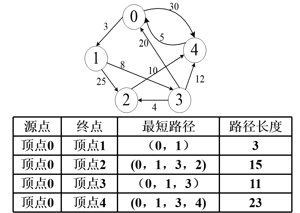 从图中某一顶点(称为源点)到达另一顶点(称为终点)的路径可能不止一条,如何找到一条路径使得沿此路径上各边上的权值总和达到最小,例: 公交查询系统。