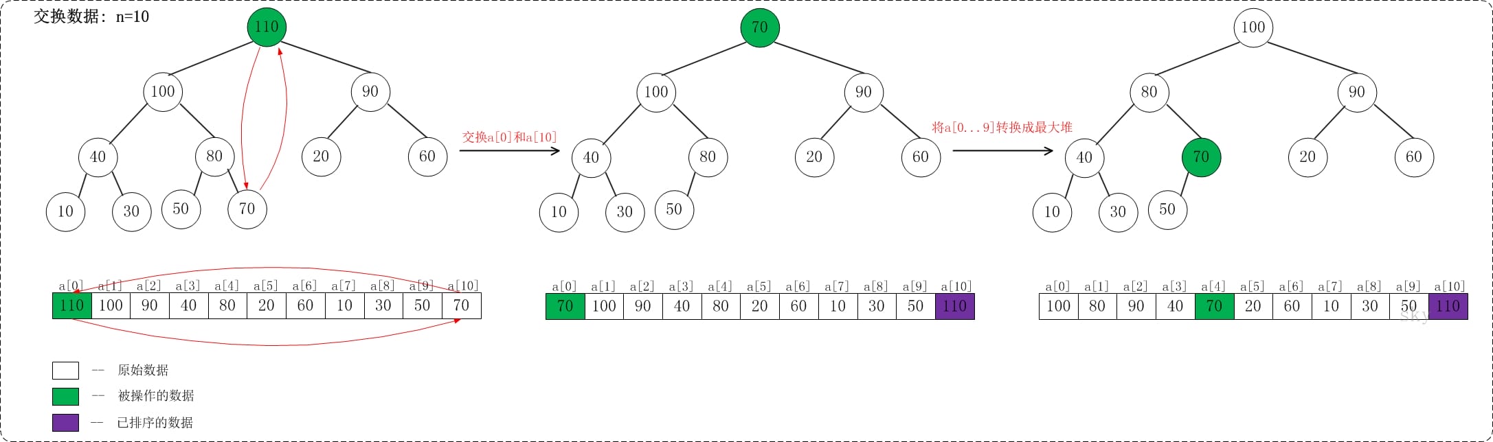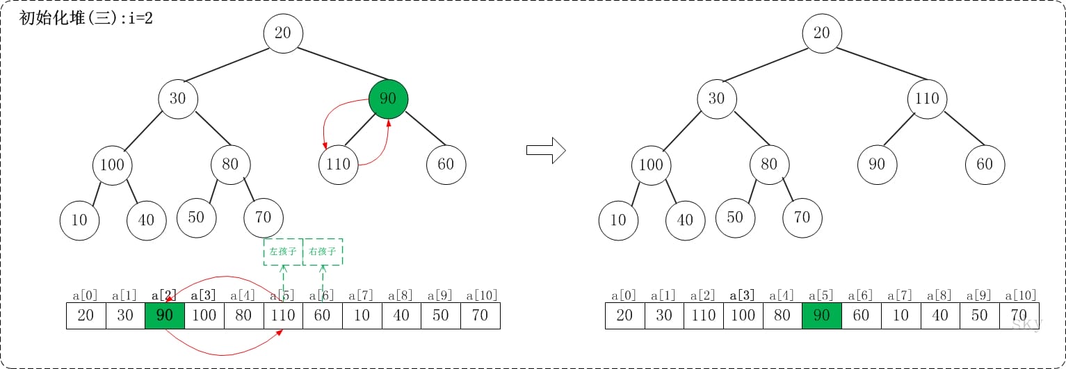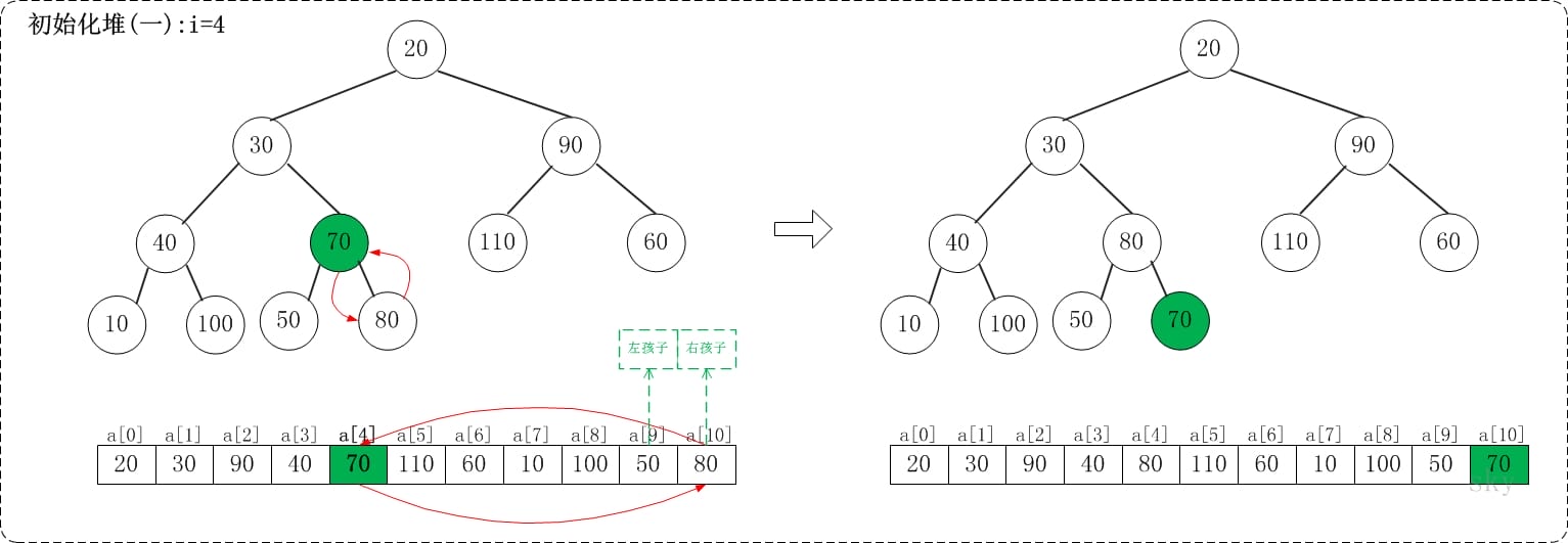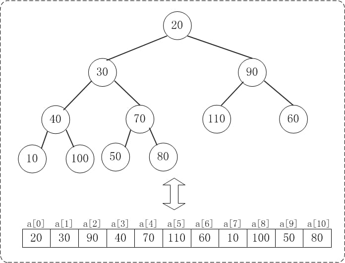 下面演示heap_sort_asc(a, n)对a={20,30,90,40,70,110,60,10,100,50,80}, n=11进行堆排序过程。下面是数组a对应的初始化结构:
