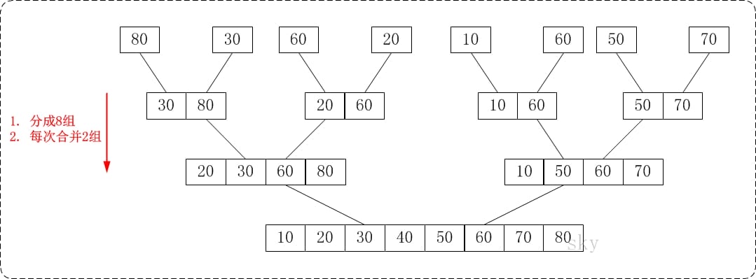 - 将这2个有序的子数列两两合并。得到1个有序的子树列{10,20,30,40,50,60,70,80}。