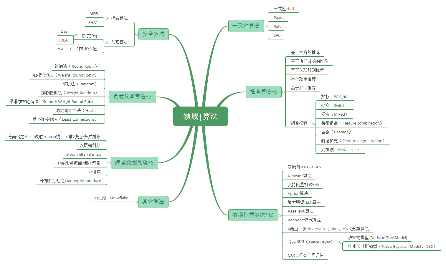 F. 领域算法之 其它算法汇总 :最后概要性的了解常见的其它算法:负载均衡算法,推荐算法,数据挖掘或机器学习算法。因为有其专业性,一般总体上了解就够了。