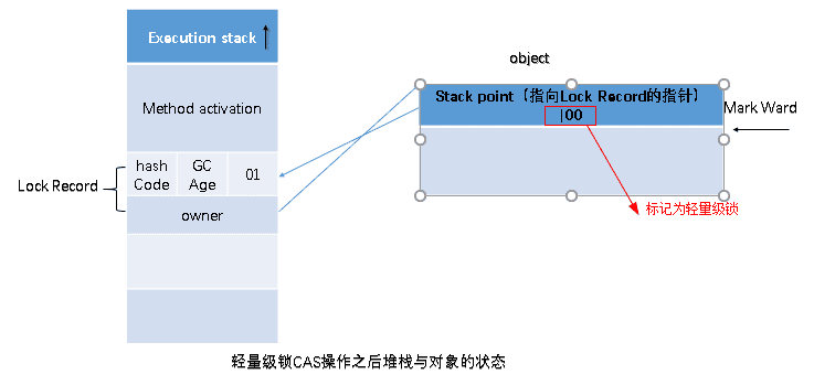 然后,虚拟机使用CAS操作将标记字段Mark Word拷贝到锁记录中,并且将Mark Word更新为指向Lock Record的指针。如果更新成功了,那么这个线程就拥用了该对象的锁,并且对象Mark Word的锁标志位更新为(Mark Word中最后的2bit)00,即表示此对象处于轻量级锁定状态,如图: