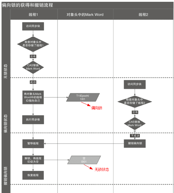 为了解决这一问题,HotSpot的作者在Java SE 1.6 中对Synchronized进行了优化,引入了偏向锁。当一个线程访问同步块并获取锁时,会在对象头和栈帧中的锁记录里存储锁偏向的线程ID,以后该线程在进入和退出同步块时不需要进行CAS操作来加锁和解锁。只需要简单的测试一下对象头的Mark Word里是否存储着指向当前线程的偏向锁。如果成功,表示线程已经获取到了锁。
