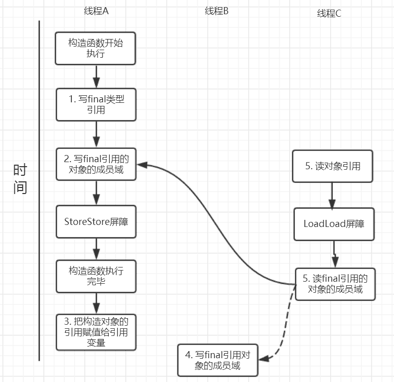 - 编译器会在final域写之后,构造函数return之前,插入一个storestore屏障。这个屏障可以禁止处理器把final域的写重排序到构造函数之外。