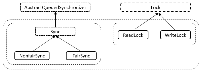 说明: 如上图所示,Sync继承自AQS、NonfairSync继承自Sync类、FairSync继承自Sync类;ReadLock实现了Lock接口、WriteLock也实现了Lock接口。