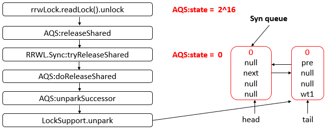 - wt1执行rrwLock.writeLock().unlock操作,主要的函数调用如下。