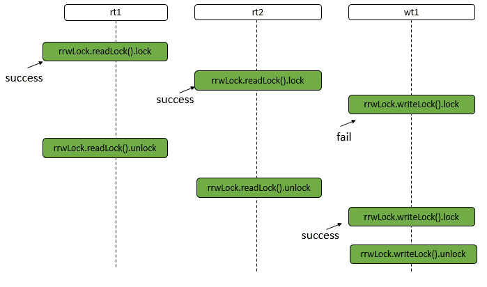 wt1 unlock successfully说明: 程序中生成了一个ReentrantReadWriteLock对象,并且设置了两个读线程,一个写线程。根据结果,可能存在如下的时序图。