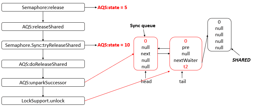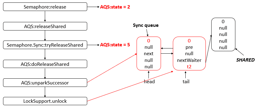 - t2线程执行semaphore.release操作。主要的函数调用如下图所示。