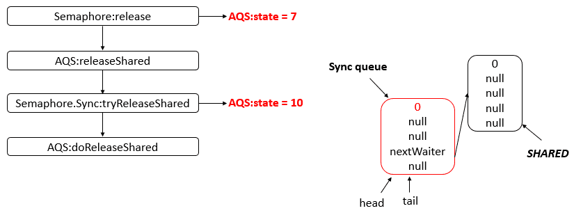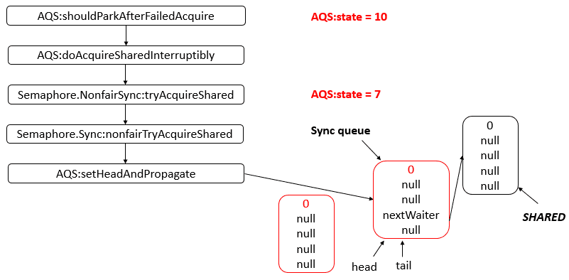 说明: t2线程经过release后,此时信号量的许可又变为10个了,此时Sync queue中的结点还是没有变化。