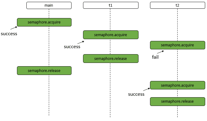 t2 release successfully说明: 首先,生成一个信号量,信号量有10个许可,然后,main,t1,t2三个线程获取许可运行,根据结果,可能存在如下的一种时序。