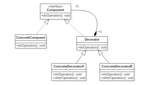 装饰者(Decorator)和具体组件(ConcreteComponent)都继承自组件(Component),具体组件的方法实现不需要依赖于其它对象,而装饰者组合了一个组件,这样它可以装饰其它装饰者或者具体组件。所谓装饰,就是把这个装饰者套在被装饰者之上,从而动态扩展被装饰者的功能。装饰者的方法有一部分是自己的,这属于它的功能,然后调用被装饰者的方法实现,从而也保留了被装饰者的功能。可以看到,具体组件应当是装饰层次的最低层,因为只有具体组件的方法实现不需要依赖于其它对象。