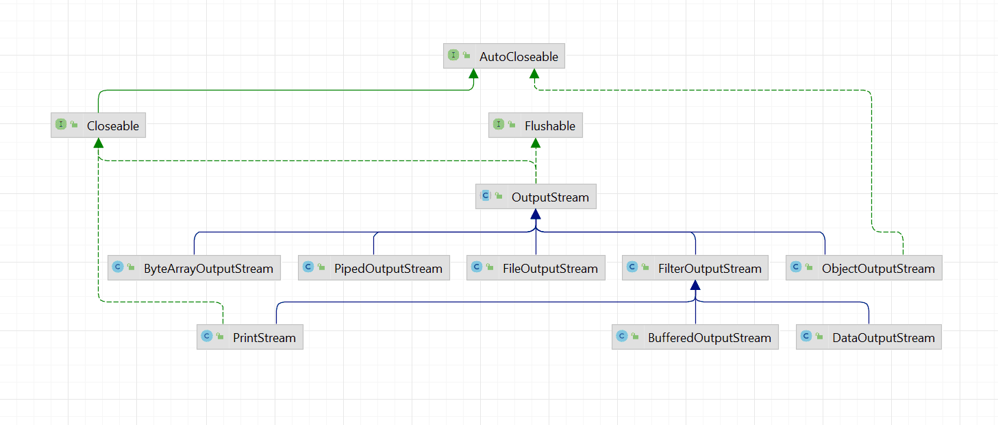 OutputStream是输出字节流,具体的实现类层次结构如下: